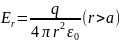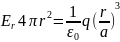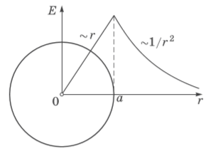 Пусть заряд q равномерно распределен по шару радиусом а. Поле такой системы, очевидно, также центрально-симметричное, поэтому и здесь для нахождения поля следует в качестве замкнутой поверхности взять концентрическую сферу. Для поля вне шара получится тот же результат, что и в предыдущем примере (сферы). Внутри же шара выражение для поля будет другим. Сфера радиусом