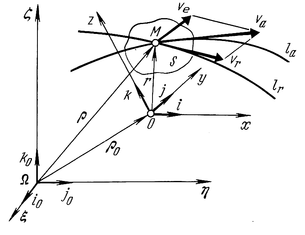 переносным движением, а скорость и ускорение той неизменно связанной с подвижной системой отсчета точки пространства, в которой в данный момент времени находится движущаяся точка, называются переносными. Другими словами, в каждый момент времени переносную скорость и переносное ускорение точки можно представить себе как ту скорость и то ускорение, которые движущаяся точка имела бы в данный момент времени, если бы она была закреплена в подвижной системе координат
