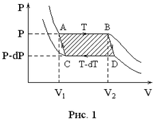 ожно получить более точную формулу для , учитывающую объемы начальной и конечной фазы. Для вывода этой формулы рассмотрим следующий бесконечно малый цикл Карно (рис. 1), в котором рабочим телом является жидкость, переходящая в пар. Пусть в точке 1 моль жидкости занимает весь объем сосуда с подвижным поршнем равный . На участке производится изотермическое испарение жидкос-ти. В точке вся жидкость переходит в пар с молярным объемом . На участке происходит адиабатическое расширение пара. При этом давление уменьшается на величину , а температура – на . На участке пар изотермически сжимается до полной конденсации в жидкость. На этапе производится адиабатическое сжатие жидкости до начального давления и начальной температуры . Работа за цикл, совершаемая рабочим телом . Тогда по теореме Карно для к.п.д. цикла получим