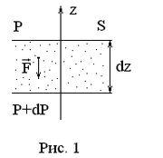 ассмотрим малый элемент объема идеального газа, заключенный между двумя площадками , перпенди-кулярными потенциальной внешней силе и отстоя-щими друг от друга на расстоянии (рис. 1). Ось направлена противоположно силе . Давления газа на верхней и нижней площадках равны соответственно и . Тогда условие равновесия выделенного объема можно представить в виде