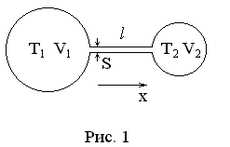 Рассмотрим конкретный процесс нестационарной теплопроводности. Два сосуда с газом с объемами , и начальными температурами , соединены трубкой длины с площадью поперечного сечения (рис. 1). Пусть . Будем считать, что вдоль трубки температура изменяется линейно