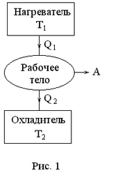 юбая тепловая машина состоит из трех основных элементов (рис. 1): нагревателя, рабочего тела и охладителя. Ее работа имеет циклический характер. В каждом цикле рабочее тело получает от нагревателя количество тепла и отдает охладителю теплоту . За каждый цикл совершается работа . Здесь , . Эффективность работы тепловой машины характеризуется коэффициентом полезного действия (к.п.д.)