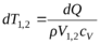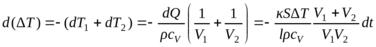При этом в сосуде 1 температура уменьшится на , а в сосуде 2 – увеличится на . Пусть плотность газа равна , а его удельная теплоемкость при постоянном объеме равна . Тогда изменения температуры газа в сосудах можно представить в виде