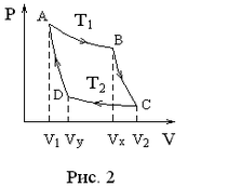 В идеальной тепловой машине рабочим телом являет-ся идеальный газ. С рабочим телом в каждом цикле про-изводится обратимый круговой процесс, назы-ваемый циклом Карно (рис. 2). Он состоит из двух изотерм ( и ) и двух адиабат ( и ). На участке рабочее тело получает тепло от нагрева-теля, а на участке – отдает тепло охладителю.