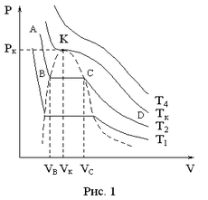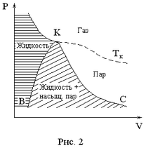 а рис. 2 представлены области различных агрегатных состояний вещества на плоскости при разных температурах . Газообразное состояние при называется паром. Он конденсируется в жидкость при изотермическом сжатии. Пар, находящийся в динамическом равновесии с жидкостью над ее поверхностью при данной температуре, называется насыщенным паром. Кривая представляет собой границу между жидким состоянием и областью фазового перехода «жидкость – пар». Ее называют кривой кипения. Кривая конденсации отделяет двухфазную область от газообразного состояния. При исчезает область двухфазного состояния. При газ нельзя перевести в жидкое состояние путем изотермического сжатия.