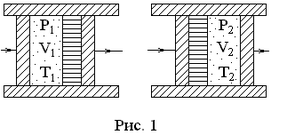 опытах Джоуля и Томсона газ нахо-дился в теплоизолированном цилиндре между двумя поршнями (рис. 1). В сред-ней части цилиндра располагалась порис-тая перегородка, обеспечивающая мед-ленное протекание газа под действием разности давлений. При стационарном течении газ не обменивался теплом с перегородкой и слева и справа от нее устанавливались постоянные давления , и температуры , . Пусть в начальном состоянии газ занимал объем в левой части цилиндра, а в конечном состоянии – объем в правой части. Тогда полная работа газа в этом процессе . Из первого закона термодинамики с учетом условия теплоизоляции получаем, что . Подставляя выражение для , приходим к сохранению энтальпии .