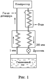 а рис. 1 представлена схема установки для сжижения газа, основанная на принципе противоточного тепло-обмена (метод Линде). Газ, идущий вверх с давлением в 1 атм, охлаждает газ, идущий вниз с давлением 200 атм. Вторая порция газа подойдет к дросселю с более низкой температурой по сравнению с первой порцией. Посте-пенное охлаждение газа холодными встречными потоками приводит к его постепенному сжижению и накапливанию в сосуде, соединенном с дросселем.