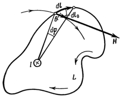Для простоты рассуждений будем считать контур, лежащим в плоскости, перпендикулярной проводнику . Получим