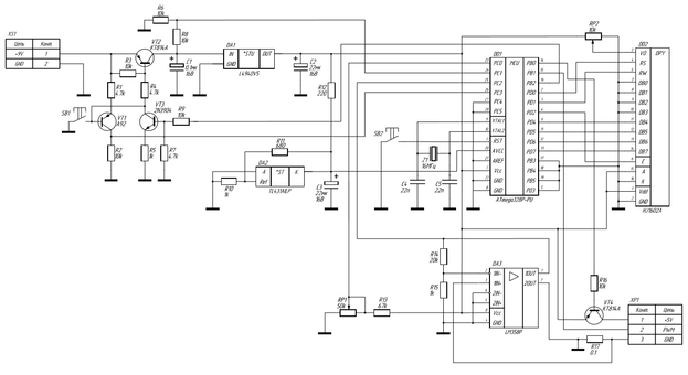 XS1 – вход с источника постоянного напряжения 9В. Резисторы R1-R5, R7, R9, транзисторы VT1-VT3 и кнопка SB1 относятся к узлу самоблокировки питания. Делитель на резисторах R6, R8 служит для замера микроконтроллером напряжения на источнике электропитания. Микросхема DA1 с электролитическими конденсаторами C1-C2 является узлом преобразователя напряжения. Микросхема DA2 и относящиеся к ней резисторы R10-R12 и электролитический конденсатор C3 составляют узел источника опорного напряжения АЦП микроконтроллера. Кнопка SB2 – кнопка сброса. Кварцевый резонатор Z1 и конденсаторы C4-C5 осуществляют функцию тактирования микроконтроллера. Подстроечный резистор RP1 совместно с резистором R13 образуем модуль органов управления. Микросхема DA3 — операционный усилитель. Она замеряет падение напряжение на обеих выводах резистора R17 и полученные данные передает на микроконтроллер для дальнейших вычислений. Для задания необходимого коэффициента усиления ОУ используются резисторы R14-R15. VT4 с R16 – транзисторный ключ, отсоединяющий нагрузку по команде микроконтроллера. XP1 – выход на сервомотор. DD2 – жидкокристаллический дисплей. Яркость встроенного в LCD светодиода подстраивается переменным резистором RP2. DD1 – микроконтроллер, как основной вычислительный модуль.