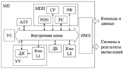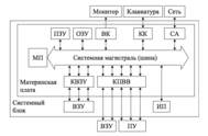 | Классификация ЭВМ: По принципу действия: аналоговые, цифровые. По назначению: универсальные, проблемно-ориентированные, специализированные. По этапам создания: 50-е(Электронные лампы), 60-е(Транзисторы), 70-е(ИС), 80-е – наше время(СБИС),Теория: (Оптоволоконные ЭВМ с массовым параллелизмом и нейронной структурой). Структурная схема ПК: | Микропроцессор. Назначение, структура и основные характеристики: Центральный̆ блок ЭВМ, управляющий̆ работой̆ всех компонент ЭВМ и выполняющий̆ операции над информацией̆. Операции производятся в регистрах, составляющих МПП. Основные функции МП: - выполнение команд программы, расположенной̆ в ОЗУ- управление пересылкой̆ информации между микропроцессорной̆ памятью, ОЗУ и периферийными устройствами; - обработка прерываний; - управление компонентами ЭВМ. | Основная память ПК: Параметры ЗУ: объем памяти, время доступа к ячейкам памяти. ОЗУ(RAM – Random Access Memory): предназначено для оперативной записи, хранения и чтения информации (программ и данных), непосредственно участвующей в информационно-вычислительном процессе, выполняемом ЭВМ в текущий период времени. После выключения питания ЭВМ, информация в ОЗУ уничтожается. ПЗУ (ROM – Read Only Memory): В момент включения ЭВМ в его ОЗУ отсутствуют данные, но МП необходимы команды, в том числе и сразу после включения. Поэтому МП обращается по специальному стартовому адресу, который ему всегда известен, за своей первой командой. Основное назначение программ из ПЗУ: проверить состав и работоспособность системы и обеспечить взаимодействие с клавиатурой, монитором, жесткими и гибкими дисками. Изменить информацию ПЗУ нельзя. Энергонезависимая память CMOS RAM (Complementary Metal-Oxide Semiconductor RAM): Хранит данные об аппаратной конфигурации ЭВМ. Вместе ПЗУ и CMOS RAM составляют BIOS. |