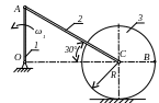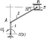 ω1 =1рад/с. В заданном положении механизма определить ускорение ползуна 3 и угловое ускорение шатуна 2, если ОА=0,1м, АВ=0,4 м.