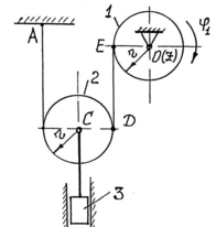 Считая, что трос по блоку 2 не скользит, определить ускорение груза 3 и угловое ускорение блока 2, если r = 0,2м.