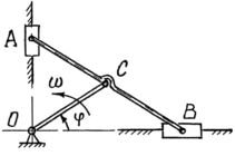 В заданном положении механизма найти скорость и ускорение точки A, а также угловые скорость и ускорение стержня АВ, если ОС=АС=CB=0,2 м, φ =30°.
