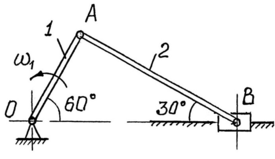 3. В кривошипно-ползунном механизме кривошип 1 равномерно вращается с угловой скоростью ω1 = 1 рад/с. В заданном положении механизма найти скорости и ускорения точек A и B, а также положение мгновенного центра ускорений линейки 2, если ОА = 0,5 м.