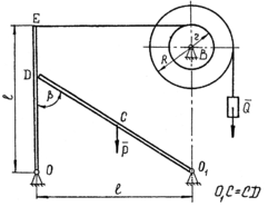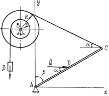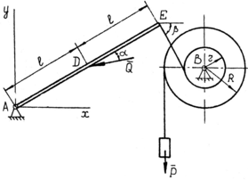 2. Найти необходимую для равновесия силу Q и реакцию в опоре B, если Р = 10 кН, R = 2r = 0,2l; l = 1 м, α = 30°, β = 60°.