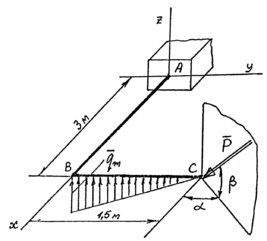 α = 60°, β = 45°, Р =6 кН, qm = 4 кН/м.
