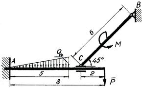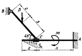 2. Найти усилие в шарнире C и момент в заделке A, если Р =10 кН, M = 16 кНм,