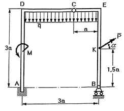 Р = 100 кН, М = 200 кНм, q = 10 кН/м, а = 1 м, α = 30°.
