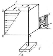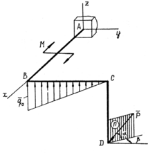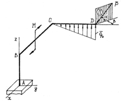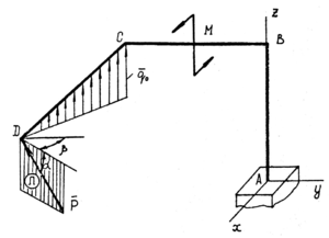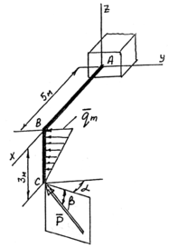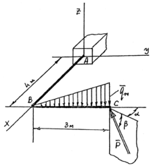 , расположенной в вертикальной плоскости, образующей с плоскостью Ayz угол α и силами, распределёнными по линейному закону с максимальной интенсивностью