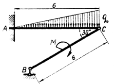 2. Найти реакцию шарнира B и момент заделки A, если M = 4 кНм, q0 = 4 кН/м (AC и BC в метрах).