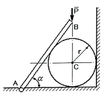 2. Цилиндр опирается на гладкую стену и гладкий пол. Радиус цилиндра равен R. На цилиндр опирается гладкий стержень, прикрепленный шарниром A к полу. В точке В стержня к нему приложена сила Р. Определить реакцию в точке А и давление цилиндра на стену, если: Р=100Н, R =0,5м, α = 60°.