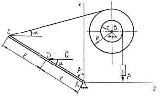 и длины ЗL, шарнирно прикрепленный к неподвижному основанию, удерживается в горизонтальном положении с помощью невесомой и нерастяжимой нити, намотанной на барабан радиуса R. В точке D стержня приложена сила