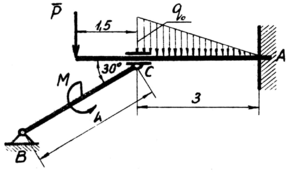 2. Найти усилие в шарнире C и момент заделки A, если P = 10 кН, M = 8 кНм, q0 = 6 кН/м (AC и BC в метрах).
