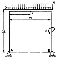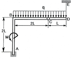 2. Г-образный стержень AВС шарнирно соединен со стержнем CD, удерживаемым в горизонтальном положении нитью DЕ. Пролет ВD нагружен равномерно распределенной силой с интенсивностью