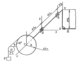 3. Коленчатый вал с жёстко насаженным на него шкивом радиуса R = 0,2 м закреплён в подшипниках А и B . К валу в точке E приложена сила Q, расположенная в плоскости, перпендикулярной к оси вала, а на шкив намотана верёвка, перекинутая через неподвижный блок и к которой привязан груз весом Р = 50 Н.