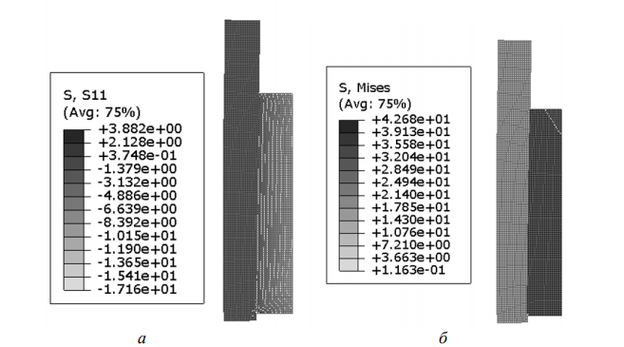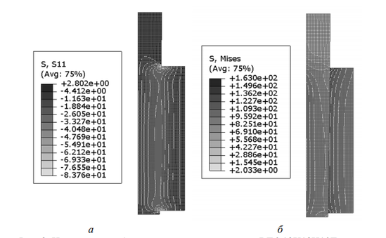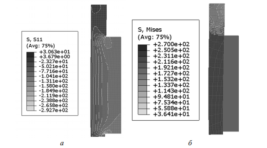 Рис. 8. Напряжения в биметаллическом соединении ВТ6-12Х18Н10Т после выдержки 10 мин: а – радиальные напряжения, МПа; б – напряжения Мизеса, МПа