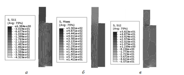 Рис. 9. Напряжения в биметаллическом соединении ВТ6-12Х18Н10Т после охлаждения до нормальной температуры: а – радиальные напряжения, МПа; б – напряжения Мизеса, МПа; в – касательные напряжения, МПа