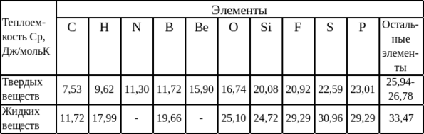 Если значения теплоемкости для некоторых твердых и жидких веществ отсутствуют в справочных данных, то в [1] рекомендуют рассчитывать их (при 298К) по атомным теплоемкостям: