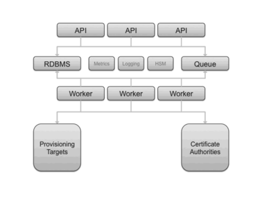 As you can see, it consists of the Relational Database Management System (RDBMS) to store keying material. The API nodes handle incoming REST requests to Barbican and if the request can be handle asynchronously, it will access RDBMS directly; otherwise, the request will be queued and processed by workers that can communicate with certificate authorities or with provisioning targets module.