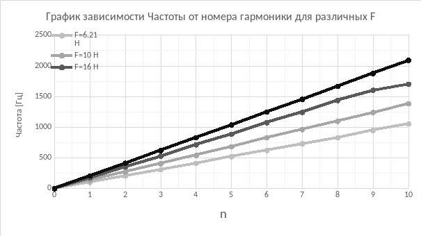 График зависимости значения частоты от номера гармоники в целом подтверждает линейную зависимость