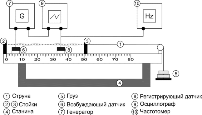 В работе используются: звуковой генератор, двухканальный осциллограф, частотомер, набор грузов, станина, с закрепленной на ней струной.