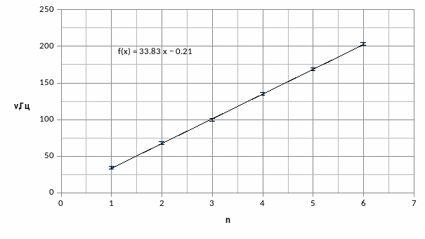 3.Изменяя частоту звукового генератора при постоянном натяжении струны, получим от 1 до 6 полуволн. Занесем значения частот генератора, при которых мы получили стоячие волны. Проделаем это 3 раза, для шести разных натяжений струны.(Систематическую погрешность звукового генератора будем считать 2 Гц)