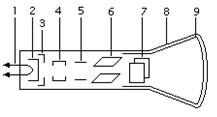 сциллограф – прибор для исследования периодических импульсных процессов. Главной частью осциллографа является электронно-лучевая трубка, представляющая собой откачанный сосуд изображенной на рисунке формы, включающий в себя катод – источник электронов, несколько ускоряющих анодов, а также конденсатор, отклоняющий электронный пучок на основе измеряемого значения, то есть, отображающий его. А также конденсатор, рассеивающий электроны перпендикулярно первому => создающий еще одну ось. После прохода через электронно-лучевую трубку электроны попадают на покрытый люминесцирующим составом экран, создавая на нем изображение.