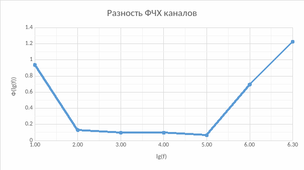Получается, что полоса пропускания лежит в диапазоне от 2 до 5, при этих значениях разность ФЧХ каналов вносит наименьшую ошибку в измерение разности фаз измеряемых сигналов.