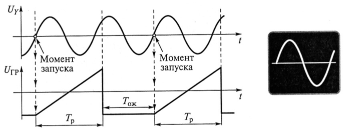 Для наблюдения периодических и быстропротекающих процессов необходимо получить статическое изображение сигнала. Для этого нужно, что бы период развертки был кратен периоду изучаемого сигнала. На практике изучаемый сигнал или генератор развертки оказываются недостаточно стабильными, поэтому на практике часто используется синхронизация развертки с сигналом. Синхронизация состоит в ожидании достижения сигналом некоторого напряжения развертки