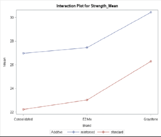 1. Используя процедуру MEANS, познакомиться с данными. [P1] Вывести средние в новый набор данных. [P2] Построить график процедурой SGPLOT, используя полученный набор данных: strength но оси Y, Additive по оси X, группировать по переменной Brand. [P3] Что вы можете сказать о данных? [P4] Основываясь на графике, нужно ли использовать пересечение факторов Additive и Brand в модели?