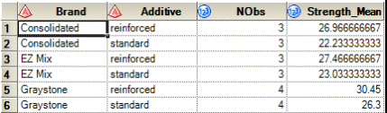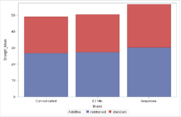 Рассмотрим эксперимент, в котором мы хотим протестировать три торговых марки (brands) бетона (concrete) и узнать делает ли добавка (additive) бетон каждой марки прочнее. Несколько участков земли было забетонировано. Следующие характеристики зафиксированы (набор данных CONCRETE_S3 в библиотеке libname mydata "/courses/u_cmc.msu.ru1/i_889205/c_6043/saslib" access=readonly; ):