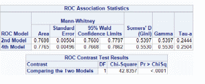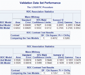 Сравнить модели используя KS (PROC NPAR1WAY) и ROC (PROC LOGISTIC) на наборах TRAIN и VALIDATE. Выбрать лучшую. Выбрать наиболее «устойчивую» (значения статистик качества на TRAIN и VALIDATE примерно равны) (см. ex6_KS и ex7_ROC_comp).