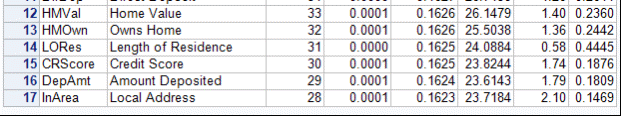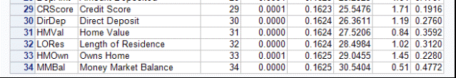 Наиболее значимыми оказались переменные ATM, ATMAmt, AcctAge, CC, CCBal, CD, CashBk, Checks, DDA, DDABal, Dep, ILS, ILSBal, InAres, Ira, Inv, LOC, LOCBal, MM, MTG, MTGBal, Moved, POS, POSAmt, Phone, SDB Sav, SavBal, Teller. |