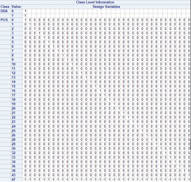 | Использую expb: proc logistic data=train1; class dda pos; model ins= dda pos dda*pos/ expb; run; В итоге — закодированные переменные dda и pos: