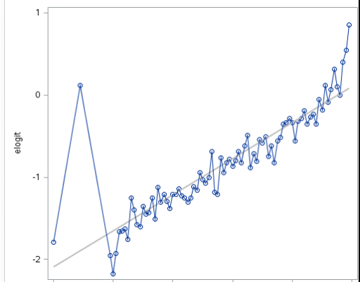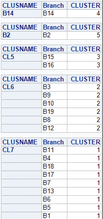 | proc means data=train1 noprint nway; class branch; var ins; output out=level mean=prop; run; proc print data=level; run; ods output clusterhistory=cluster; proc cluster data=level method=ward outtree=fortree plots=(dendrogram(vertical height=rsq)); freq _freq_; var prop; id branch; run; proc freq data=train1 noprint; tables branch*ins / chisq; output out=chi(keep=_pchi_) chisq; run; data cutoff; if _n_ = 1 then set chi; set cluster; chisquare=_pchi_*rsquared; degfree=numberofclusters-1; logpvalue=logsdf('CHISQ',chisquare,degfree); run; proc sgplot data=cutoff; scatter y=logpvalue x=numberofclusters / markerattrs=(color=blue symbol=circlefilled); xaxis label="Number of Clusters"; yaxis label="Log of P-Value" min=-170 max=-130; title "Plot of the Log of the P-Value by Number of Clusters"; run; title; proc sql; select NumberOfClusters into :ncl from cutoff having logpvalue=min(logpvalue); quit; proc tree data=fortree nclusters=&ncl out=clus; id branch; run; proc sort data=clus; by clusname; run; proc print data=clus; by clusname; id clusname; run; data train1_5; set train1; brclus1=(branch in ('B6','B9','B19','B8','B1','B17','B3', 'B5','B13','B12','B4','B10')); brclus2=(branch='B15'); brclus3=(branch='B16'); brclus4=(branch='B14'); run;