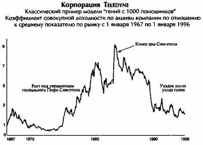 Модель «гений с 1000 помощников» особенно часто встречается в тех компаниях, которые смогли добиться только краткосрочного успеха. Классический пример - Генри Синглтон, по прозвищу Сфинкс, из компании Teledyne. Синглтон вырос на техасском ранчо, с детских лет мечтая стать великим бизнесменом с характером жесткого индивидуалиста. Вооружившись дипломом доктора наук Массачусетского технологического университета (MIT), он основал Teledyne.21 Название Teledyne происходит от греческого «сила, примененная на расстоянии» - удачное название, поскольку основной силой, удерживавшей обширную империю Teledyne, был сам Генри Синглтон.