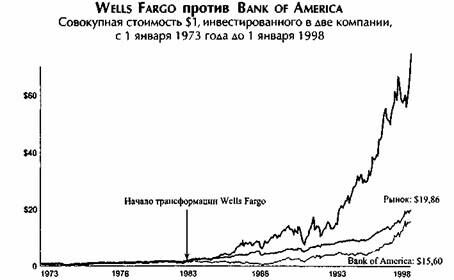 Один из ушедших в отставку руководителей Bank of America назвал высшее руководство банка в 1970-е «пластиковыми людьми, которых научили покорно подчиняться диктату президента компании».10 После того, как Bank of America потерял больше $1 млрд в середине 1980-х, руководство наняло команду талантливых «генералов», чтобы осуществить необходимые преобразования. И где же они нашли этих генералов? А прямо через дорогу, в Wells Fargo. Bank of America нанял так много бывших руководителей Wells Fargo, что внутри компании эти люди начали называть себя «Wells of America»[24].11 И акции Bank of America снова начали расти, но было слишком поздно. С 1973 по 1998, когда Wells Fargo переходил от этапа наращивания потенциала к этапу стремительного роста, доходность по акциям Bank of America не догнала средний показатель по рынку.