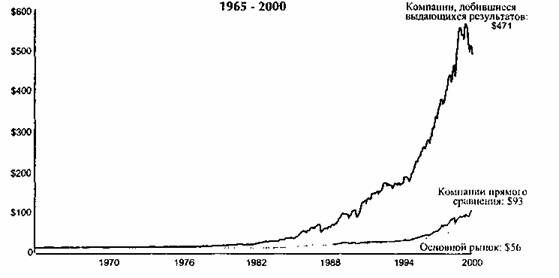 Те компании, которым удалось перейти из разряда «хороших» в разряд «великих», согласно нашей классификации, и которые мы включили в данное исследование, добились исключительных результатов - средняя доходность по акциям этих компаний в течение 15 лет после их преобразования в 6,9 раз выше, чем средний показатель по рынку.2 Сравните этот показатель с результатами General Electric (компания, которая в конце XX века, как многие утверждают, имела лучший состав высшего руководства в США), чья доходность по акциям за 15 лет с 1985 по 2000 превысила средний показатель по рынку только в 2,8 раза.3 Более того, если бы вы инвестировали $1 в общий фонд компаний, перешедших из разряда «хороших» в разряд «великих» в 1965, предполагая, что до этого момента доходность по этим акциям была равна средней по рынку, и одновременно инвестировали бы $1 в фонд, который включал бы все акции на рынке[6], ваша инвестиция в компании, осуществившие переход, 1 января 2000 года увеличилась бы в 471 раз, инвестиция в акции всех компаний на рынке увеличилась бы лишь в 56 раз.