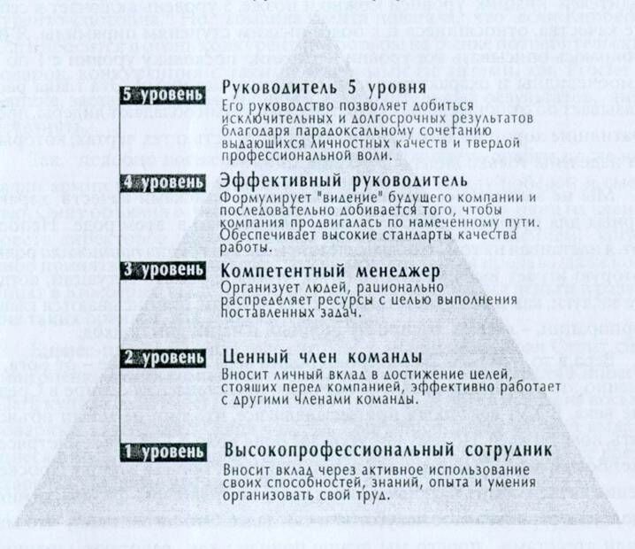 Руководители компаний, которые добились выдающихся результатов, все оказались как будто из одного теста. Неважно, производит ли компания товары народного потребления или промышленные товары, находится она в кризисном или благополучном состоянии, предлагает товары или услуги. Неважно, когда происходили преобразования и каков размер компании. Во главе всех компаний, достигших выдающихся результатов, во время осуществления преобразований стояли руководители 5 уровня. Более того, отсутствие руководства 5 уровня характерно для компаний, использованных для сравнения. Таким образом, концепция «руководителей 5 уровня» вступает в противоречие с расхожим мнением о том, что для осуществления преобразований на предприятиях нам позарез нужны «спасители», признанные лидеры с высокой самооценкой. Важно отметить, что концепция «руководителей 5 уровня» выведена на основе эмпирических данных и не является идеологическим ходом.