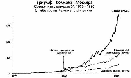 В конце концов Моклер и совет директоров доказали, что они были правы. Если бы те, кто хотел продать акции, приняли 44%-пую премию, предложенную Рональдом Перельманом 31 октября 1986 года, и затем инвестировали все эти деньги в рынок на десять лет до конца 1996, то их суммарная прибыль была бы в три раза ниже, чем прибыль тех, кто инвестировал в Моклера и Gillette.20 Действительно, если бы Моклер сдался «налетчикам», положив себе в карман миллионы долларов, это было бы против интересов компании, ее клиентов и ее акционеров.